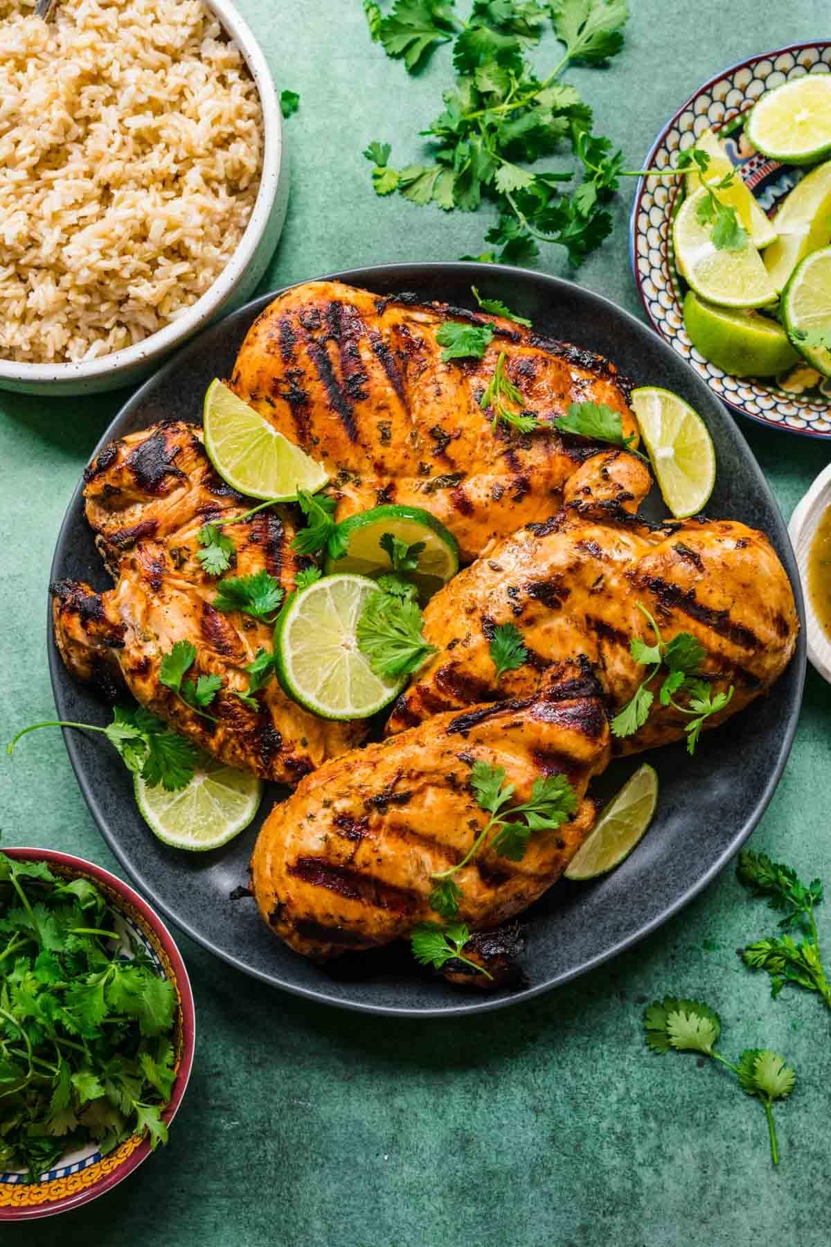 3. Heat the grill to about 450°F. Arrange the chicken on the grill, and cook for about 30 to 35 minutes, turning two to three times once it has seared. Cook to an internal temperature of at least 165°F. Serve with lemon and lime wedges.